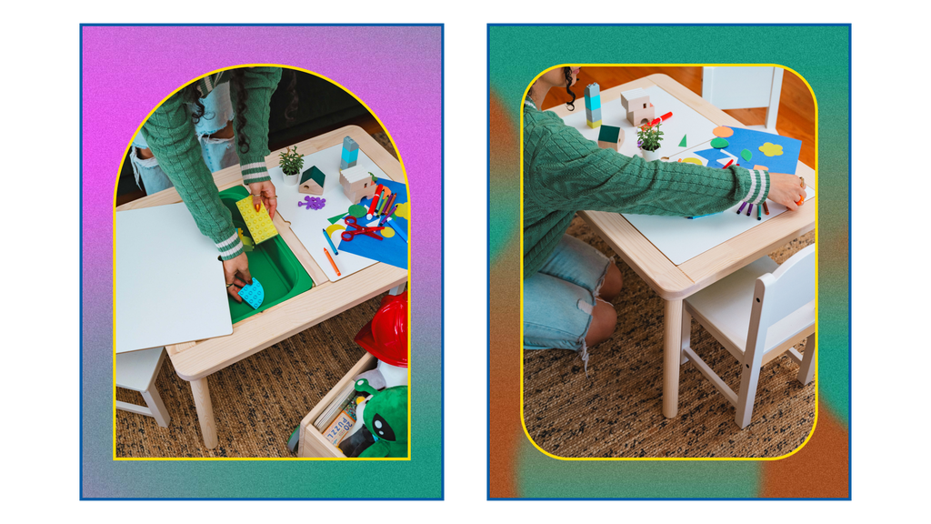 “I wanted them to have the space and the ability to do what they want. they’re two-and-a-half, so keeping them busy is a huge part of my day-to-day life,” she says. “They’re always home with me, so it’s convenient to have a table where they can color, eat and play.”