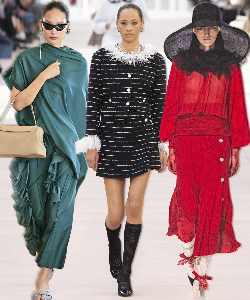 The jacket silhouette that has held sway at Chanel for decades has made headlines in recent seasons. This time, it serves as the basis for a feminine look completed with accessories such as trendy pillbox hats (as seen at Chloé, Marni and Loro Piana) and ruffled and lace collars, sometimes of the Peter Pan variety (Ganni, Jil Sander ). At Acne, a bubble dress is accented with floral gloves and peep-toe heels, signaling a return to sophistication.