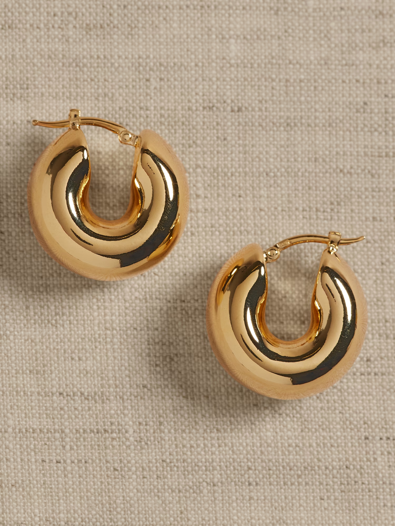 Chunky gold hoops balance boldness with timeless charm. Whether you go sleek and sculptural or bold and chunky, they effortlessly highlight everything from minimalist outfits to cozy knits – because, sometimes, bigger is better.